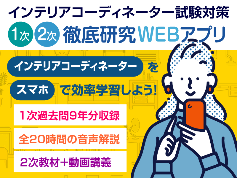 2026年度試験対応「インテリアコーディネーター1次2次試験徹底研究WEBアプリ」申込受付中!<お持ちのスマートフォンで学習できるので、通勤時間や移動時間、昼休み、就寝前などのスキマ時間に学習できます。>