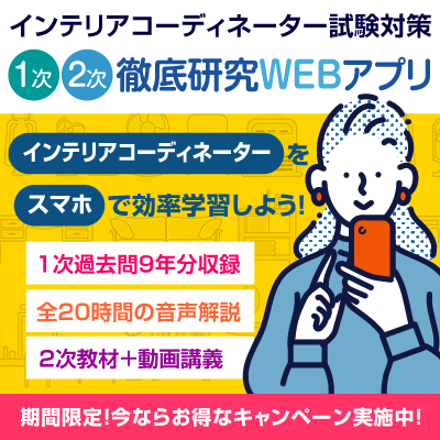 2026年度試験対応「インテリアコーディネーター1次2次試験徹底研究WEBアプリ」申込受付中!<お持ちのスマートフォンで学習できるので、通勤時間や移動時間、昼休み、就寝前などのスキマ時間に学習できます。>