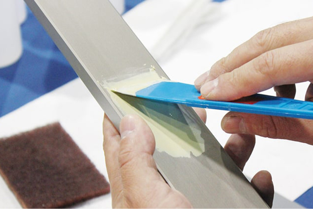アルミリペアマイスターとは住宅に幅広く使用されているアルミのキズ補修が学べる講座です。アルミサッシの基礎知識やマスキングの方法、実践として表面のクリア層についたすりキズと、物をぶつけた時にできる打痕キズの2種類のキズの補修方法が学べます。