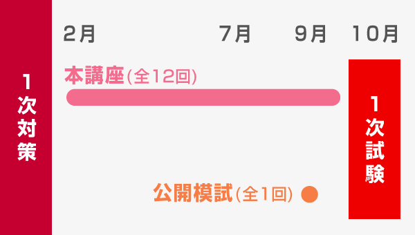 | 総講座数 | 1次対策講座(全12回)+1次模擬試験(全1回) (※講義回数は2時間を1回とした場合です。) |