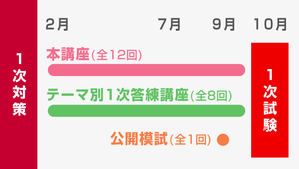| 総講座数 | 1次対策講座(全20回)+1次模擬試験(全1回) (※講義回数は2時間を1回とした場合です。) |