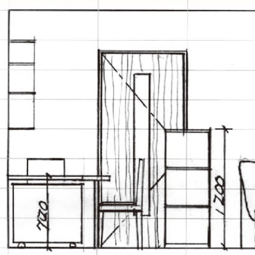 サッシやドアなどの開口部の高さ寸法を記すとともに、インテリア試験では、家具の立面や断面、カーテンや照明機具なども表現します。平面図に次いで出題数の多い図面です。