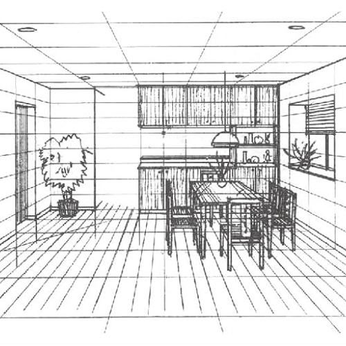実際の「見た目」に近い立体表現を可能にする図面。絵画やプレゼンテーション図面に多用され、別名「遠近法」や「透視図」とも呼ばれています。