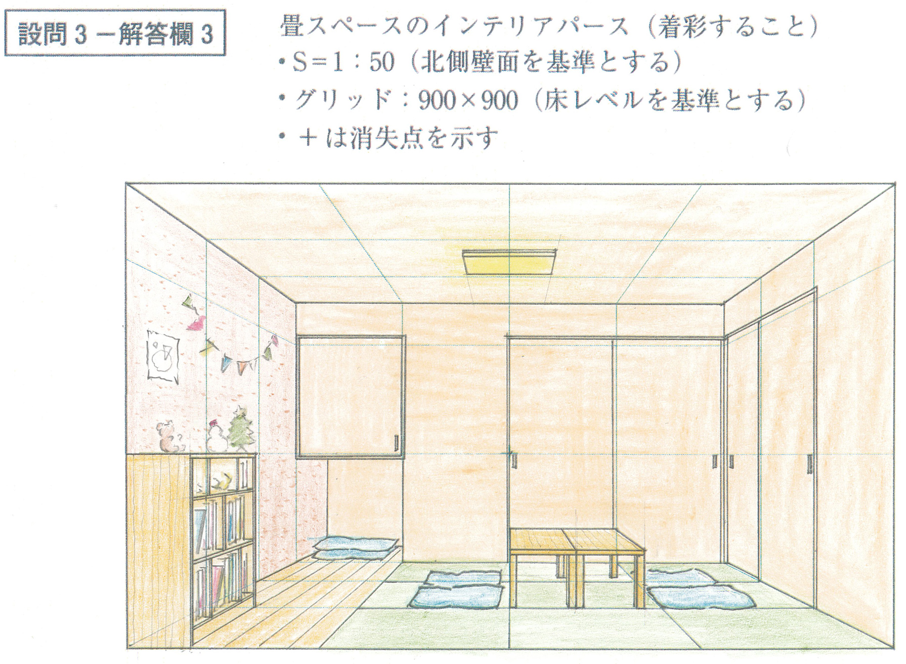 プレゼンテーション(製図)試験では、図面作成能力が問われ、「平面図」はもちろん年によって「立・断面図(展開図)」や「立体図面(パースやアイソメ図)」が要求されます。