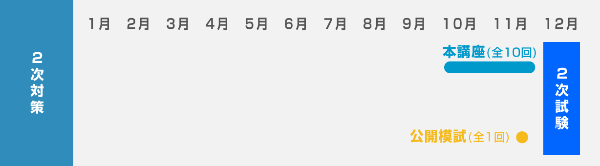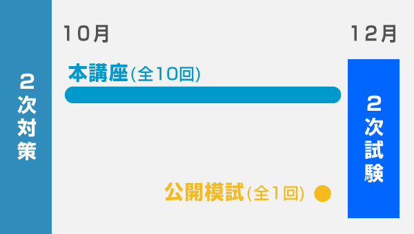 | 総講座数 | 2次対策本講座(全10回)+2次模擬試験(全1回) (※講義回数は2時間を1回とした場合です。) |