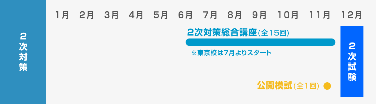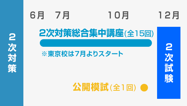 | 総講座数 | 2次対策講座(全15回)+2次模擬試験(全1回) (※講義回数は2時間を1回とした場合です。) |