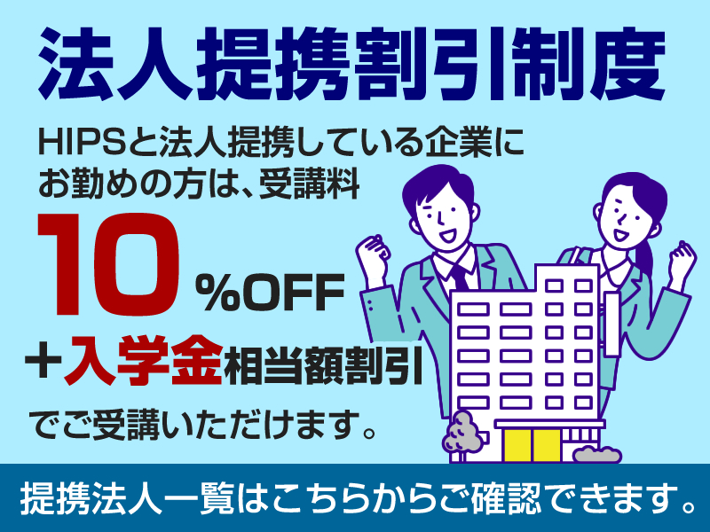 高い合格実績が特徴のHIPSでは、講義内容、カリキュラム、受講生のサポート体制に自信を持っています。万が一その年の試験に不合格だった場合は、翌年の授業を無料で受講できる合格保証制度があります。対象となるには出席率等の条件がありますので、詳しくはお問い合わせ下さい。