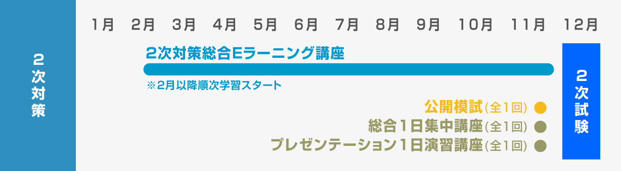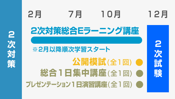 | 総講座 | Sコース2次対策講座(16課題)+2次模擬試験+総合1日集中講座+プレゼンテーション1日演習講座 Aコース2次対策講座(16課題)+2次模擬試験+総合1日集中講座 |
