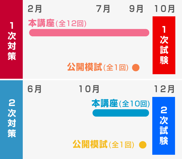 | 総講座数 | 1次対策講座(全12回)+1次模擬試験(全1回)+2次対策講座(全10回)+2次模擬試験(全1回) (※講義回数は2時間を1回とした場合です。) |