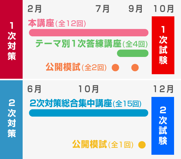 | 総講座数 | 1次対策講座(全16回)+1次模擬試験(全2回)+2次対策講座(全15回)+2次模擬試験(全1回) (※講義回数は2時間を1回とした場合です。) |