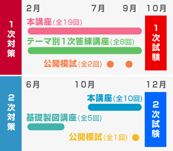 | 総講座数 | 1次対策講座(全27回)+1次模擬試験(全2回)+2次対策講座(全15回)+2次模擬試験(全1回) (※講義回数は2時間を1回とした場合です。) |