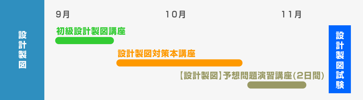 「初級設計製図講座」「設計製図対策本講座」「【設計製図】予想問題演習講座(2日間)」がセットになったコースです。
