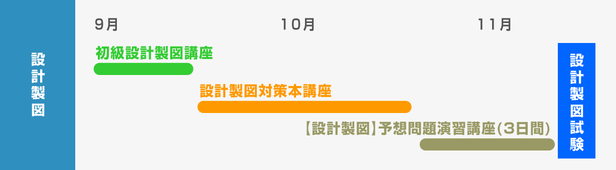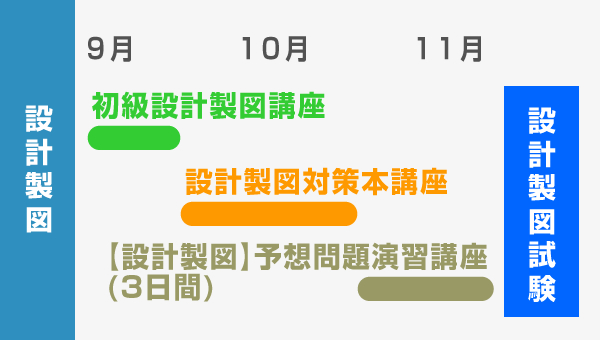 「初級設計製図講座」「設計製図対策本講座」「【設計製図】予想問題演習講座(3日間)」がセットになったコースです。