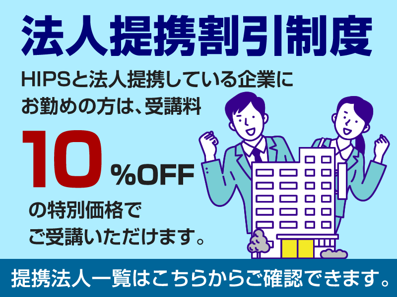 ※HIPS受講生(卒業生)とは、過去にHIPSの長期講座(講義時間が合計20時間以上のもの)を受講いただいた方となります。対象かどうかご不明な場合は、事務局までお問い合せ下さい。 ※提携法人とは、HIPSと提携いただいている企業にお勤めの方が対象となります。 >>提携企業一覧はこちら ※現在、大学・短大・専門学校(学校法人)・高校に在学中の方は、学生価格が適用となります。価格の適用には、学生証等の在学証明の提出が必要となります。 |