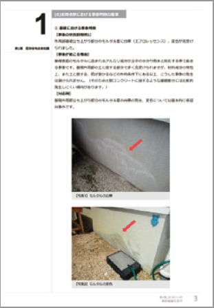 | ①住宅の保証書について ②基礎における事象判断 ③玄関ポーチ、犬走り等における事象判断 ④床下における判断事象 ⑤外壁における事象判断 ⑥ベランダにおける事象判断 ⑦壁・天井におけるクロスの事象判断 ⑧傷・隙間の事象判断 ⑨床の不陸の事象 ⑩トイレ便器本体の水漏れ事象判断 ⑪シロアリ申告に対する事象判断 ⑫害虫進入に対する事象判断 ⑬害獣などの事象判断 ⑭住宅診断時の床下における事象判断 ⑮住宅診断時の小屋裏における事象判断 |