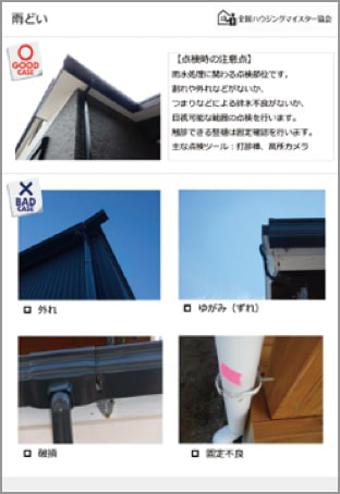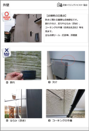 | ①ご訪問の挨拶、点検及び保証内容の説明 ②確認及び伝達事項、不具合の聞き取り ③建物外部の点検における注意点 ④建物内部の点検における注意点 ⑤定期点検結果報告、確認及び次回点検の説明 ⑥点検で使用した図面・チェックリスト、その他帳票、撮影した画像の管理について ⑦定期点検報告書の作成 |