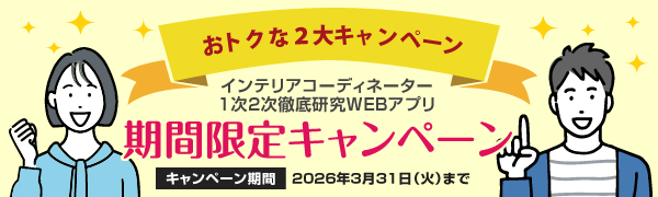 おトクなキャンペーン実施中!今ならインテリアコーディネーター徹底研究WEB アプリがおトクにご利用いただけます! ![]() ![]() |